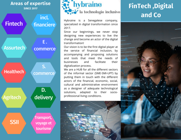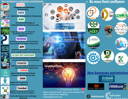 Hybraine SAS est une société de droit sénégalais spécialisée dans la transformation digitale. Elle se positionne comme fournisseur de technologie pour ses partenaires et un services - Center pour le client final